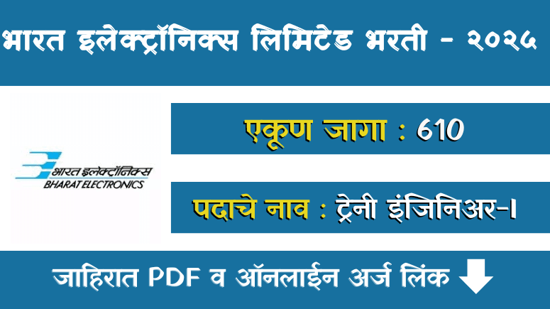 भारत इलेक्ट्रॉनिक्स लिमिटेड मध्ये काम करण्याची इच्छा असणाऱ्या उमेदवारांसाठी महत्त्वाची बातमी आहे. भारत इलेक्ट्रॉनिक्स लिमिटेड मध्ये ट्रेनी इंजिनिअर-I पदांसाठी (BEL Bharti 2025) 610 जागांसाठी भरती सुरू आहे. इच्छुक उमेदवार ऑनलाइन अर्ज करू शकतात.