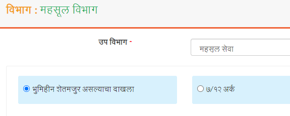 हा विभाग निवडल्यानंतर त्याअंतर्गत उपलब्ध असलेल्या सेवांची यादी दिसेल यामध्ये शेतकरी असल्याचा दाखला, विनिश्चिती प्रमाणपत्र देणे, जातीचे प्रमाणपत्र, मिळकतीचे प्रमाणपत्र, भुमिहीन शेतमजुर असल्याचा दाखला असे बरेच पर्याय दिसतील. त्यातील “भुमिहीन शेतमजुर असल्याचा दाखला” या पर्यायावर क्लिक करायचे आहे, नंतर पुढे जा वर क्लिक करायचे आहे.